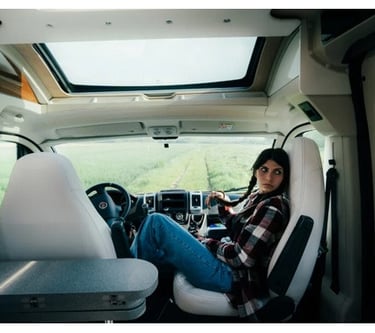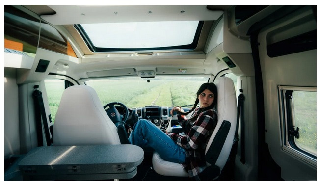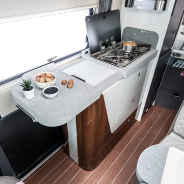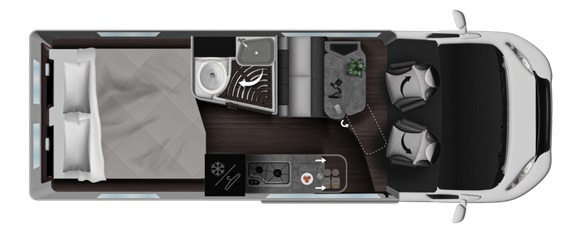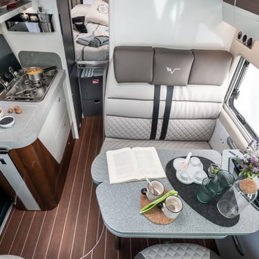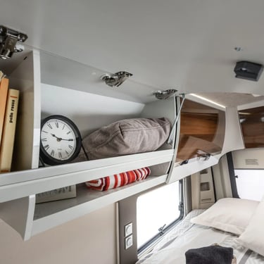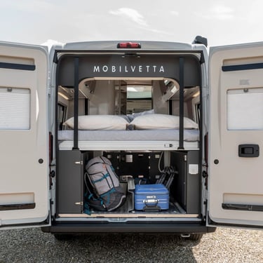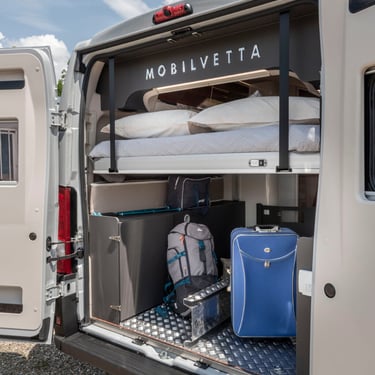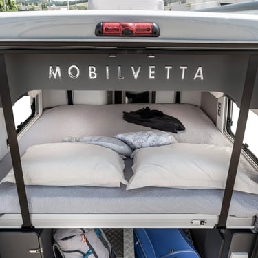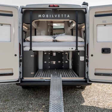 VAN cu pat pliant electric și garaj reglabil pe înălțime, pentru depozitare și echipamente. Ideală pentru un cuplu sau o familie de 3 persoane.