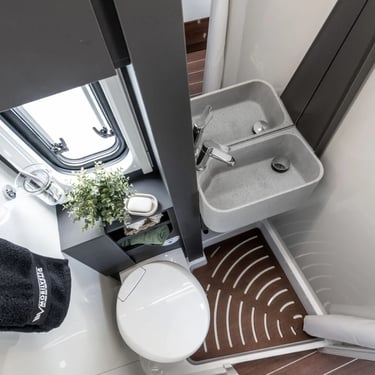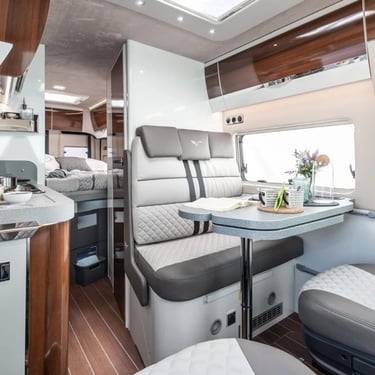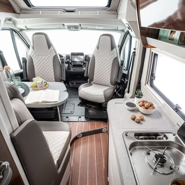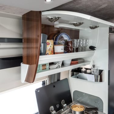 Asemenea panoului exclusivist de tavan tapițat cu piele ecologică. Integrat inteligent în mediul tavanului, acesta încorporează acoperișul panoramic și hubloul într-o continuitate armonioasă. Îmbunătățit cu lumini LED pentru atmosfera potrivită, buzunare frontale de depozitare, jaluzele și plasele anti-zgârieturi. Ușile laminate lucioase, în continuitate cu corpurile de mobilier suspendate, îmbină cabina cu spațiul deschis și conferă uniformitate unei încăperi înconjurate de pereți izolatori de înaltă calitate, moi la atingere.