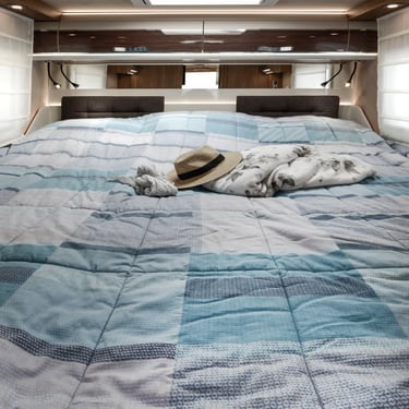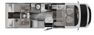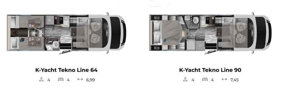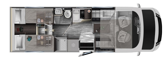 Autorulota cu paturi twin maxi, zone separate și un living spațios față în față. Canapele mari care pot fi transformate în 2 locuri orientate spre direcția de mers pentru călătorie.