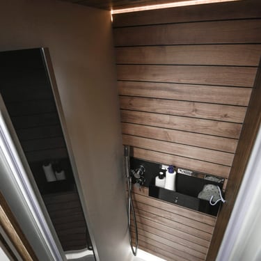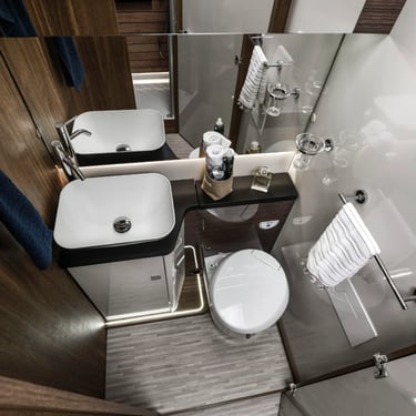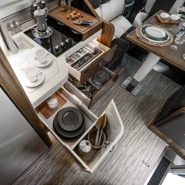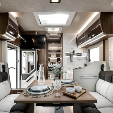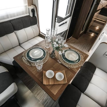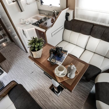 Experimentează dinetul la maximum alegând dimensiunea și poziția în funcție de starea de spirit a momentului: dinetul față în față are canapele mari care pot fi transformate în 2 locuri orientate spre direcție pentru călătorii, iar masa pliabilă cu piciorul cromat de înaltă calitate, cu protecție din piele ecologică, ocupă puțin spațiu. Ca într-un living adevărat, confortul unui șezlong, între scaunul pasagerului și canapelele laterale. Cine va vrea vreodată să iasă afară?