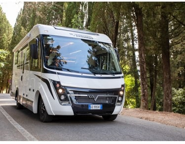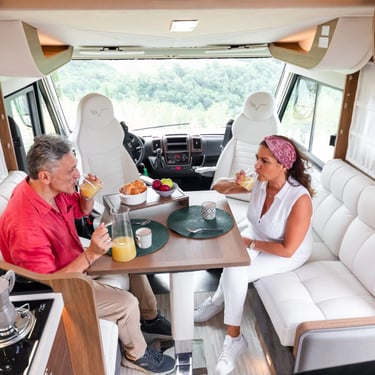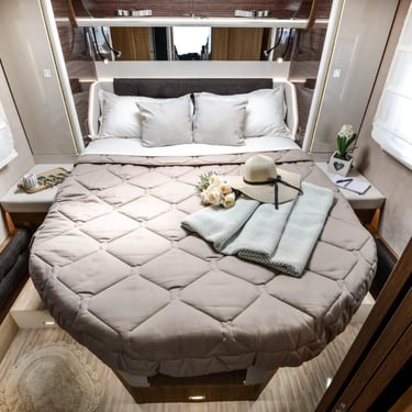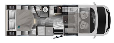 Autorulota Clasa A cu pat queen-size, camere separate și un living spațios față în față. Autorulota ideală atât pentru cupluri, cât și pentru familii.