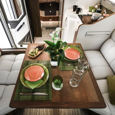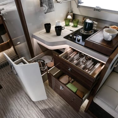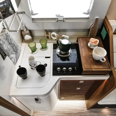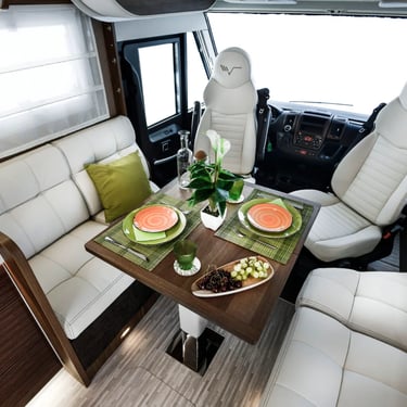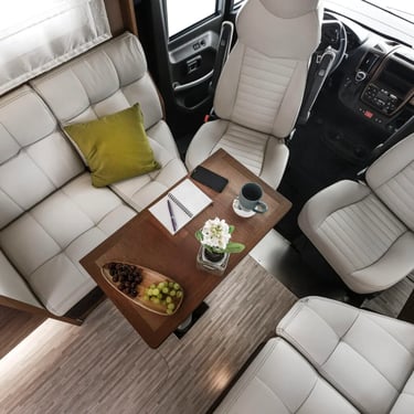 Experimentează dinetul la maximum alegând dimensiunea și poziția în funcție de starea de spirit a momentului: dinetul față în față are canapele mari care pot fi transformate în 2 locuri orientate spre direcție pentru călătorii, iar masa pliabilă cu piciorul cromat de înaltă calitate, cu protecție din piele ecologică, ocupă puțin spațiu. Ca într-un living adevărat, confortul unui șezlong, între scaunul pasagerului și canapelele laterale. Cine va vrea vreodată să iasă afară?