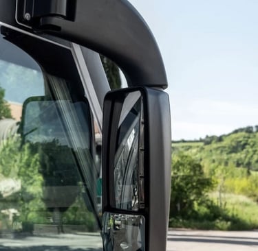 Oglinzi retrovizoare în stil autocar, pentru autorulote, bine integrate în estetica generală și bine poziționate pentru un câmp vizual larg și liber.