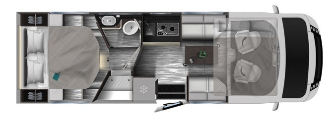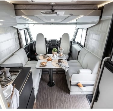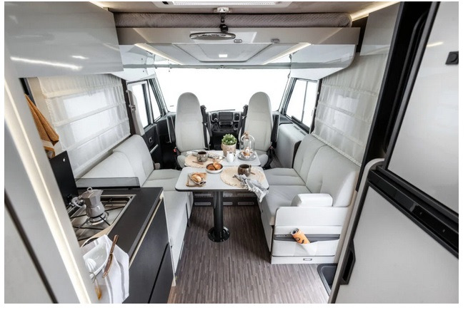 Autorulotă cu pat matrimonial, 7,47 metri lungime, cu salon mare față în față.