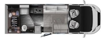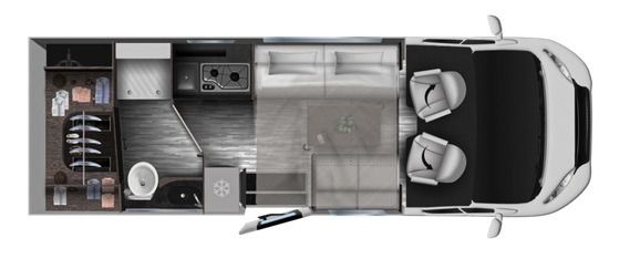 Profil redus compact, cu zonă de living frontală mare, dinetă față în față, toaletă transversală în spate și dulap mare.