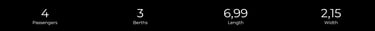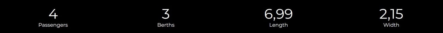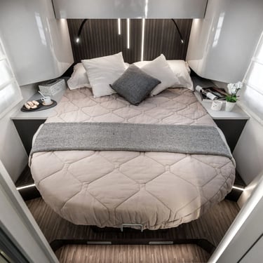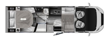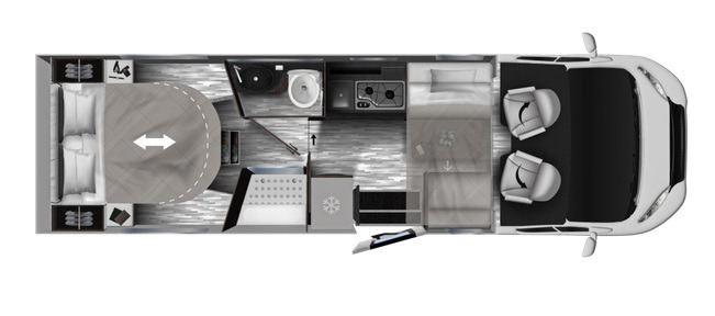 Compact cu profil redus, cu living frontal față în față, baie transversală cu duș separat și bază de pat centrală glisantă cu reglare pe înălțime.