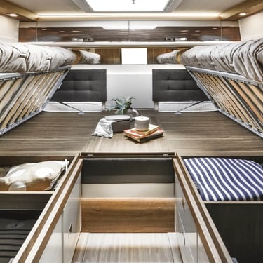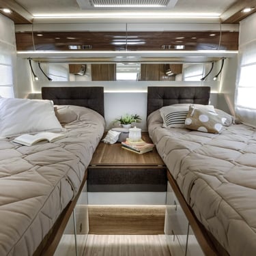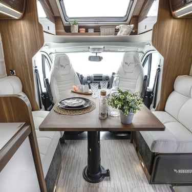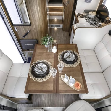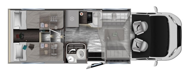 Pentru cuplul entuziast, Mobilvetta prezintă Krosser 64: modelul Low Profile, cu o lungime mai mică de 7 m, cu paturi twin și o baie cu volum variabil.